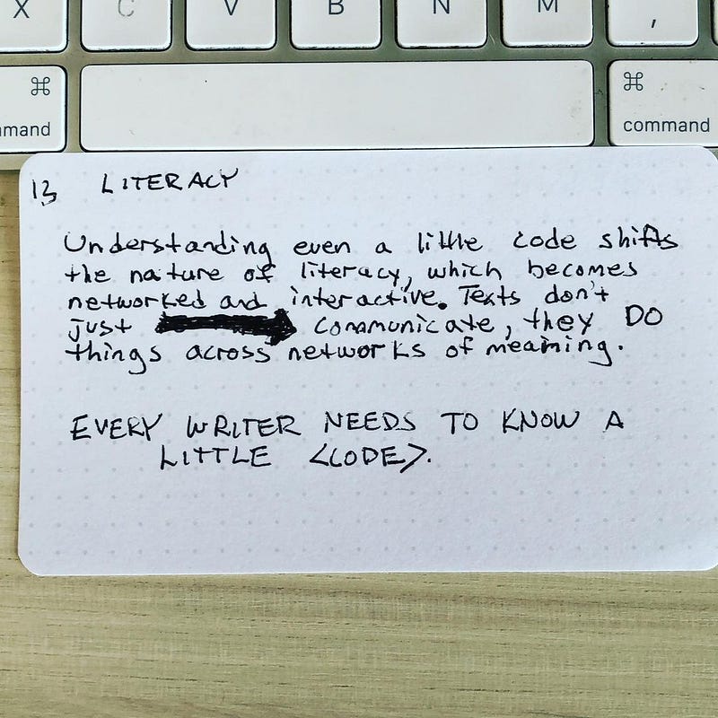 Understanding even a little code shifts how we understand literacy, which becomes networked and interactive. Now texts don’t just communicate, they do things across networks of meaning.