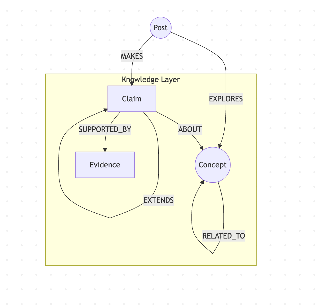 The second decision was adding Claims. Most writers think of posts as being “about” topics. But when I added a node type for Claims—with properties like statement, claim type, and confidence level, each post became a collection of assertions at various stages of development. Some claims I state definitively. Others I mark as provisional. A few are speculative, ideas I’m testing rather than defending.