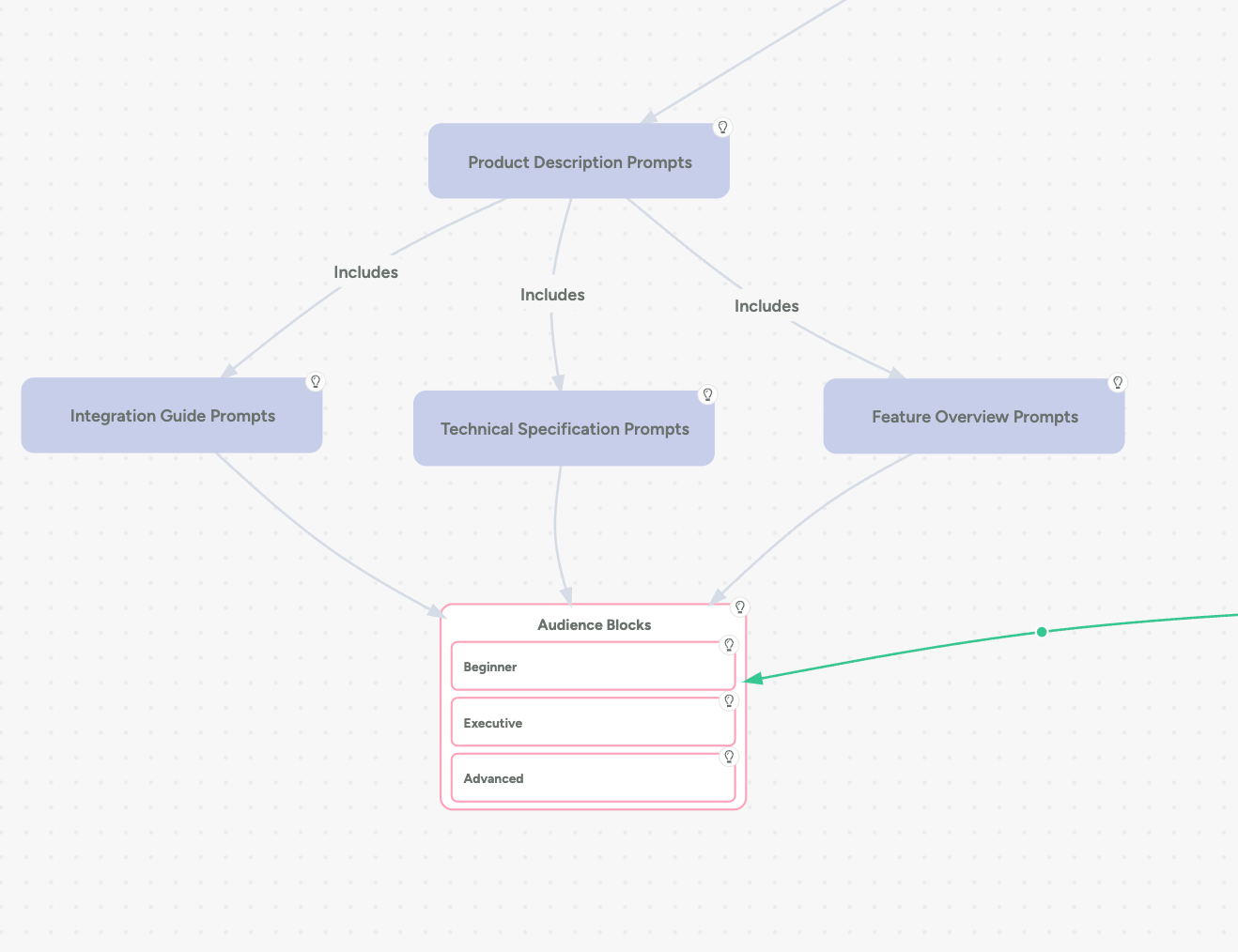 For example, a mind map for product launch prompts might reveal that your "audience" prompt blocks connect not just to product documentation, but also to sales content, customer support scripts, and technical blog posts. This insight might lead you to create more versatile audience prompts that serves multiple content workflows.