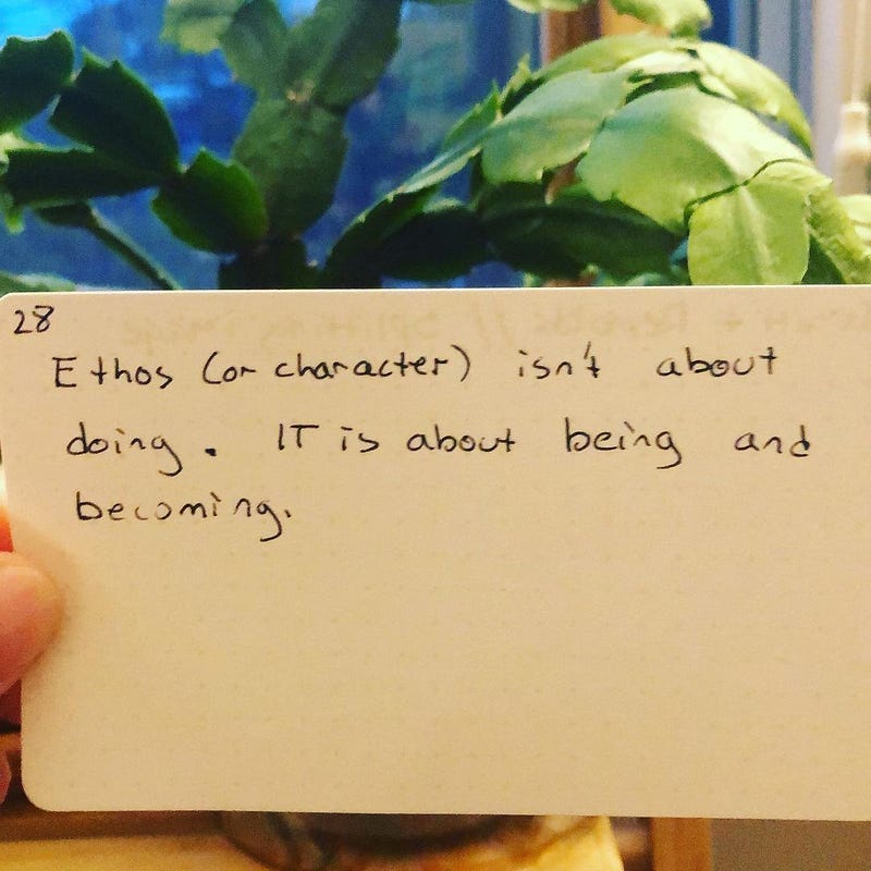 If we understand ethos as character, then it cannot be about doing. Ethos is about being and becoming. We cultivate character by doing good things, and then other people will notice that we are doing good things and they will be attracted to us. This is the basic human mechanism for developing char…