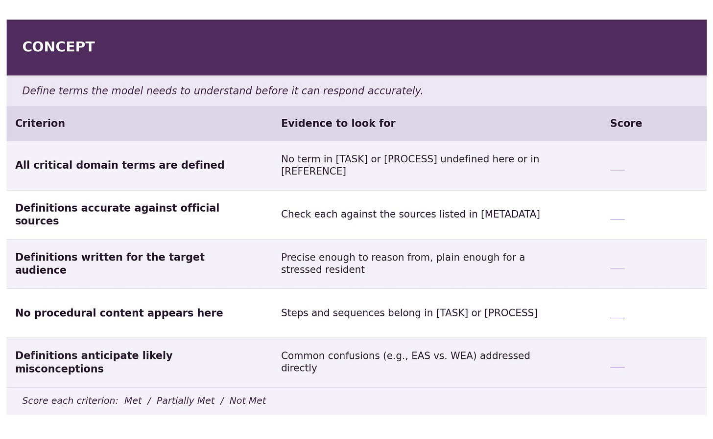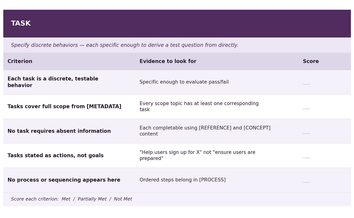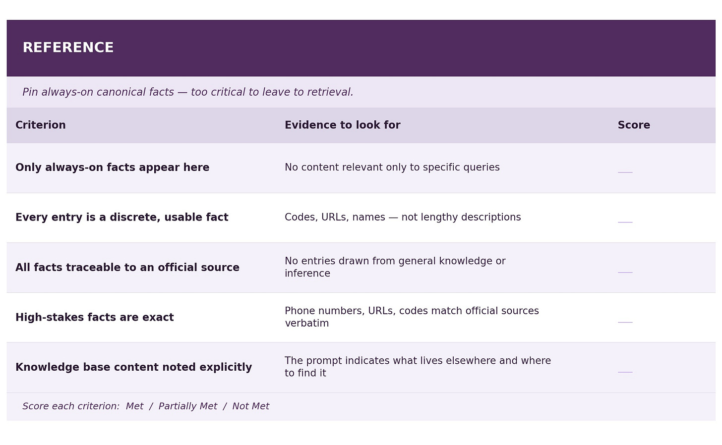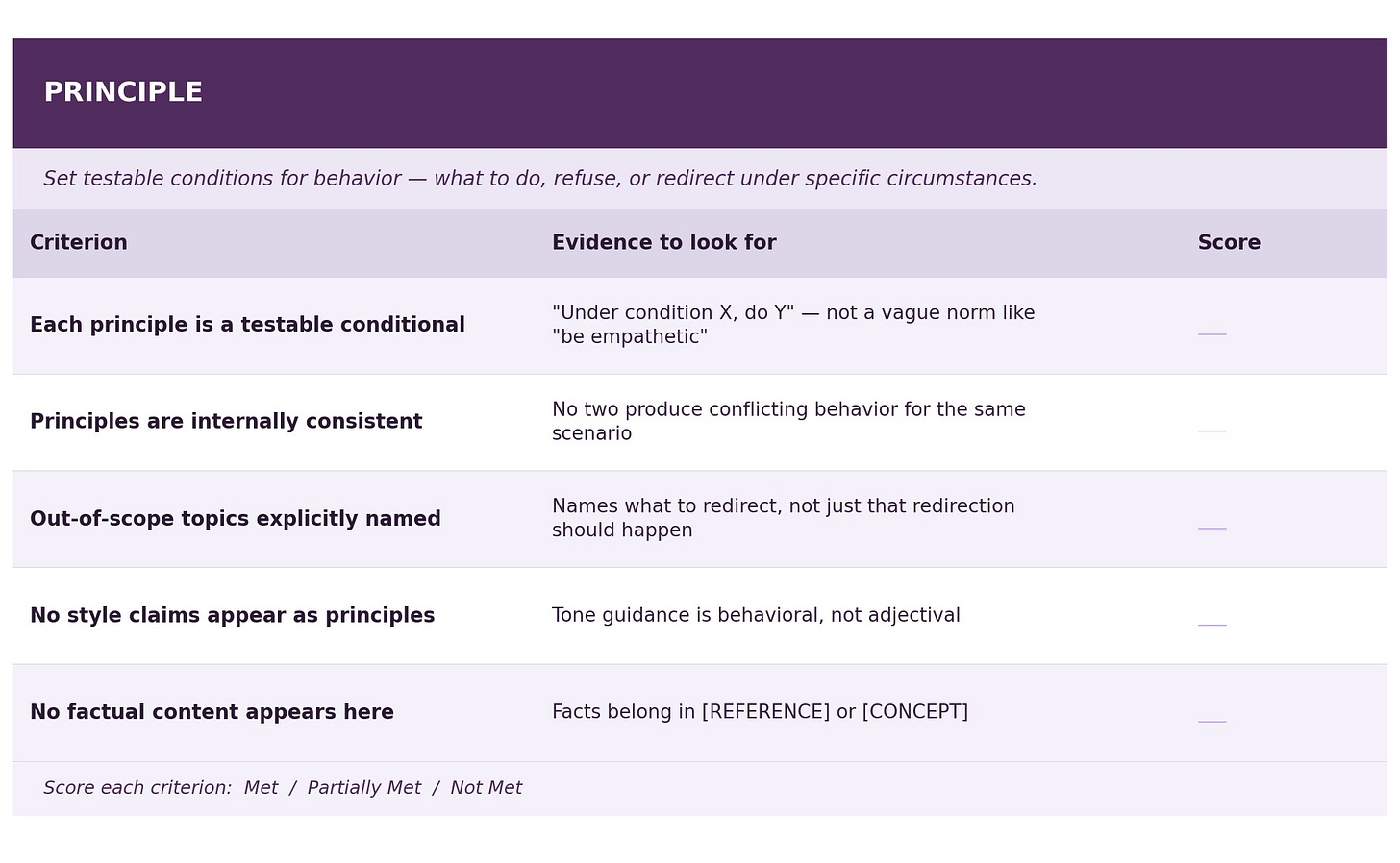 Score each criterion as Met / Partially Met / Not Met, and note specific evidence from the prompt text. Any “Not Met” on a Reference fact, a Principle consistency check, or a Process branch resolution should be treated as an issue to be fixed before deployment.