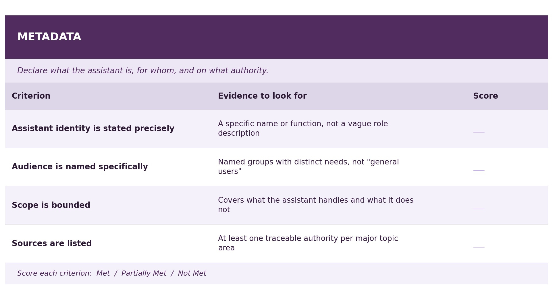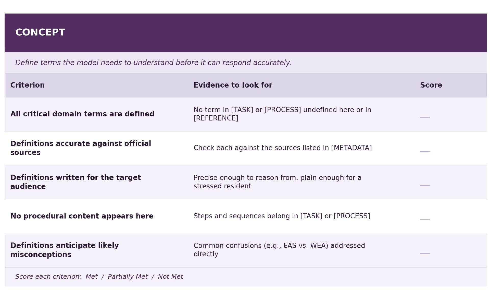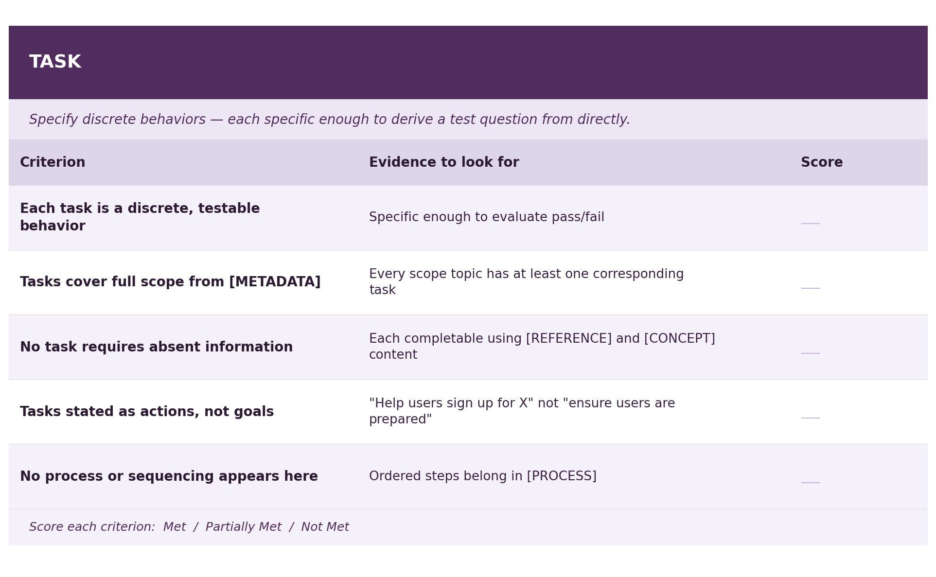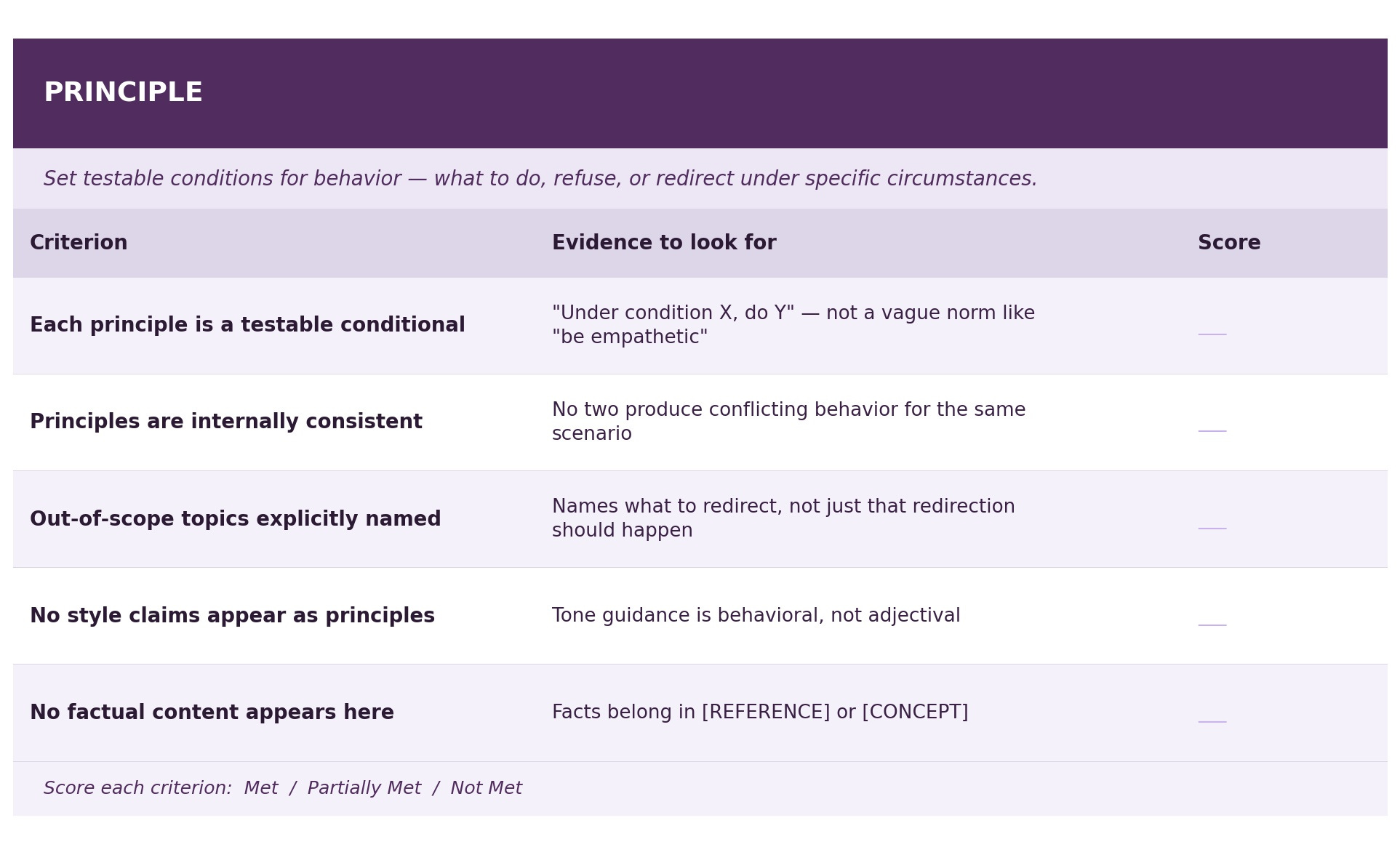 Score each criterion as Met / Partially Met / Not Met, and note specific evidence from the prompt text. Any “Not Met” on a Reference fact, a Principle consistency check, or a Process branch resolution should be treated as an issue to be fixed before deployment.