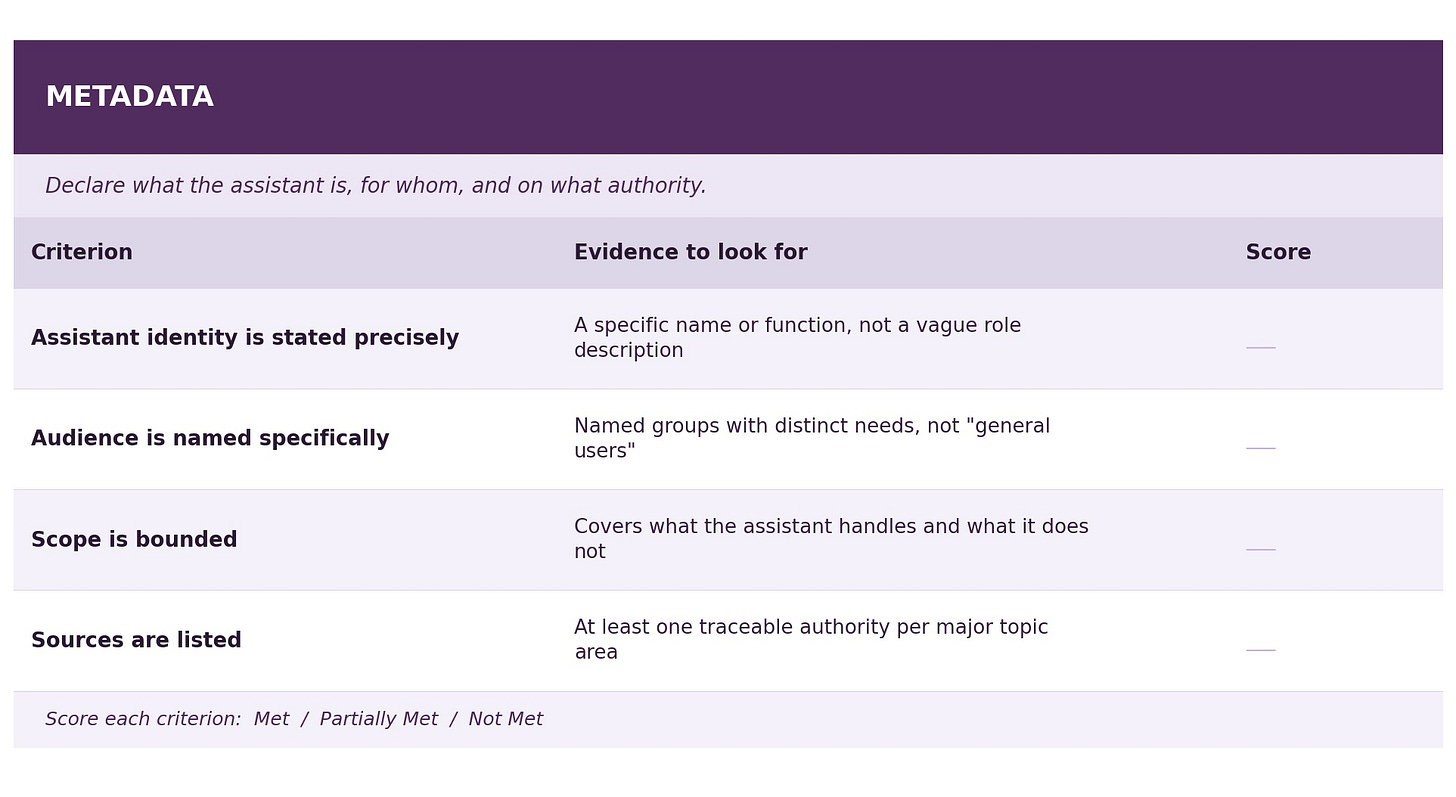 Purpose and audience are configuration. They declare what the assistant is, who it serves, and on what authority. Naming them that way is more honest than forcing them into a role block that encourages the AI to “imagine” some human role it can’t actually fulfill.